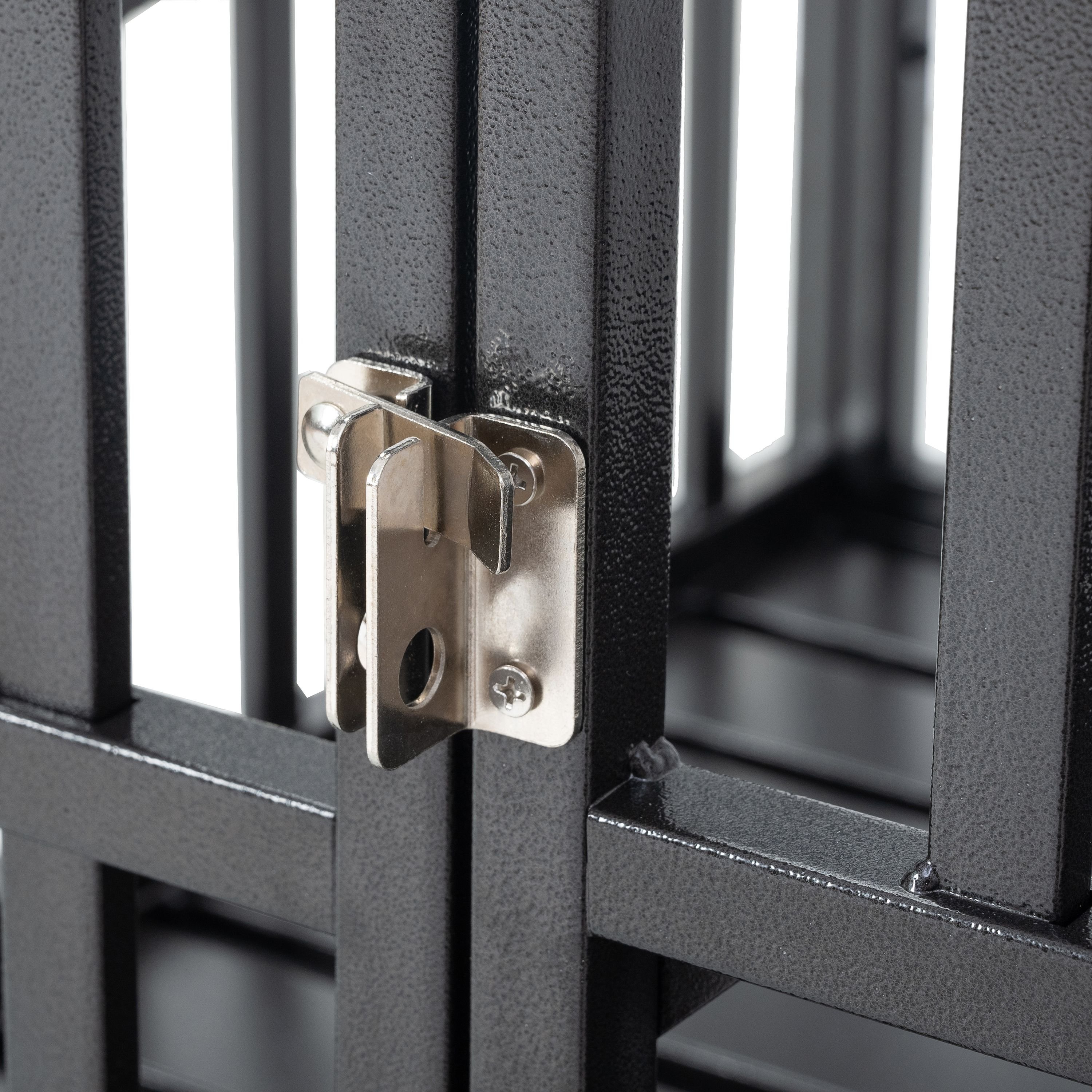1. Each cage has a front door and a Roof Door, The both doors locked with 2 patent latches.2. These pet crate also have an ultra-durable, multi-layer finish that is much stronger than the "electro"or "powder"coats seen in inferior cages. This hammertone finished is rust, corrosion and fade resistant. Suitable for outdoor and indoor use.3. Every crate features 2 removable plastic pans. This design makes it easier to keep your pet clean and makes mess removal a breeze. The pans made from ABS for easy cleaning, it has an integrated lip around the perimeter to contain any mess. Both trays are held securely in place to prevent slipping but can be quickly removed for cleaning. 4. These crates also feature 4 lockable caster wheels, all of which lockable to prevent accidental movement.5. The crate ship partially assembled, please follow the instructions strictly to assemble it, all tools needed are attached.6. Please do not make the screws tighten when you firstly connect the parts, after the construction correctly, then tighted all the screws.6. For maximum comfort, the crate should be sized 4" to 6" longer than the dog's body length, and 4" to 6" taller than its shoulder height. If the animal is not fully grown, please consult a breed chart to approximate the dog's future adult size, and choose a crate accordingly