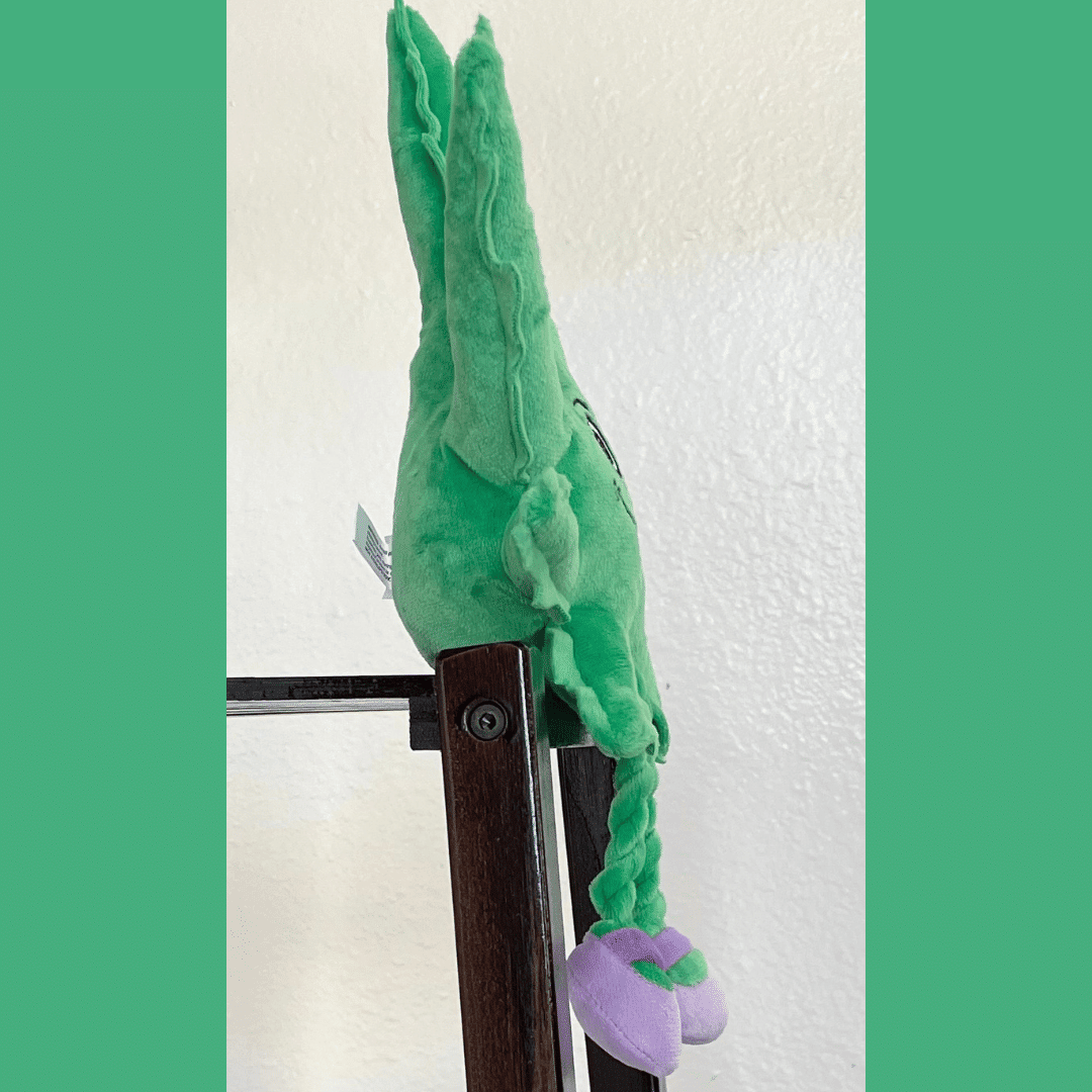 Mary Jane is approximately 9" across and 13" from her top leaf to her purple Mary Jane shoes. She is a happy leaf filled with crinkle paper and a squeaker your dog will love. Her legs are soft rope great for light play. Best of all she is made to sit on a shelf or surface while not in use. She looks super cute on your desk; shelf or anywhere.