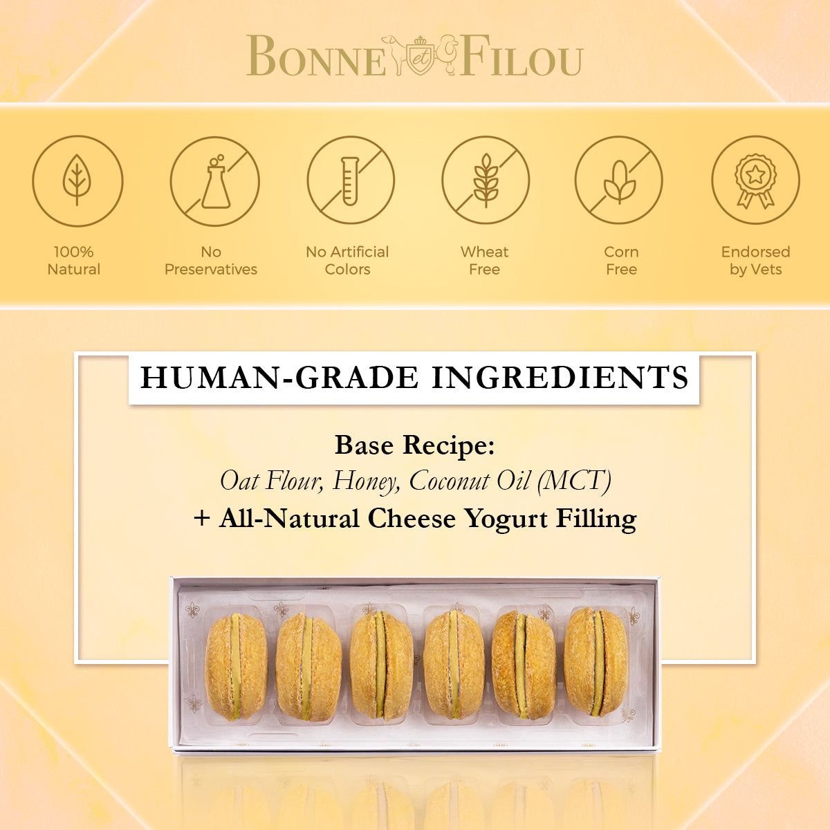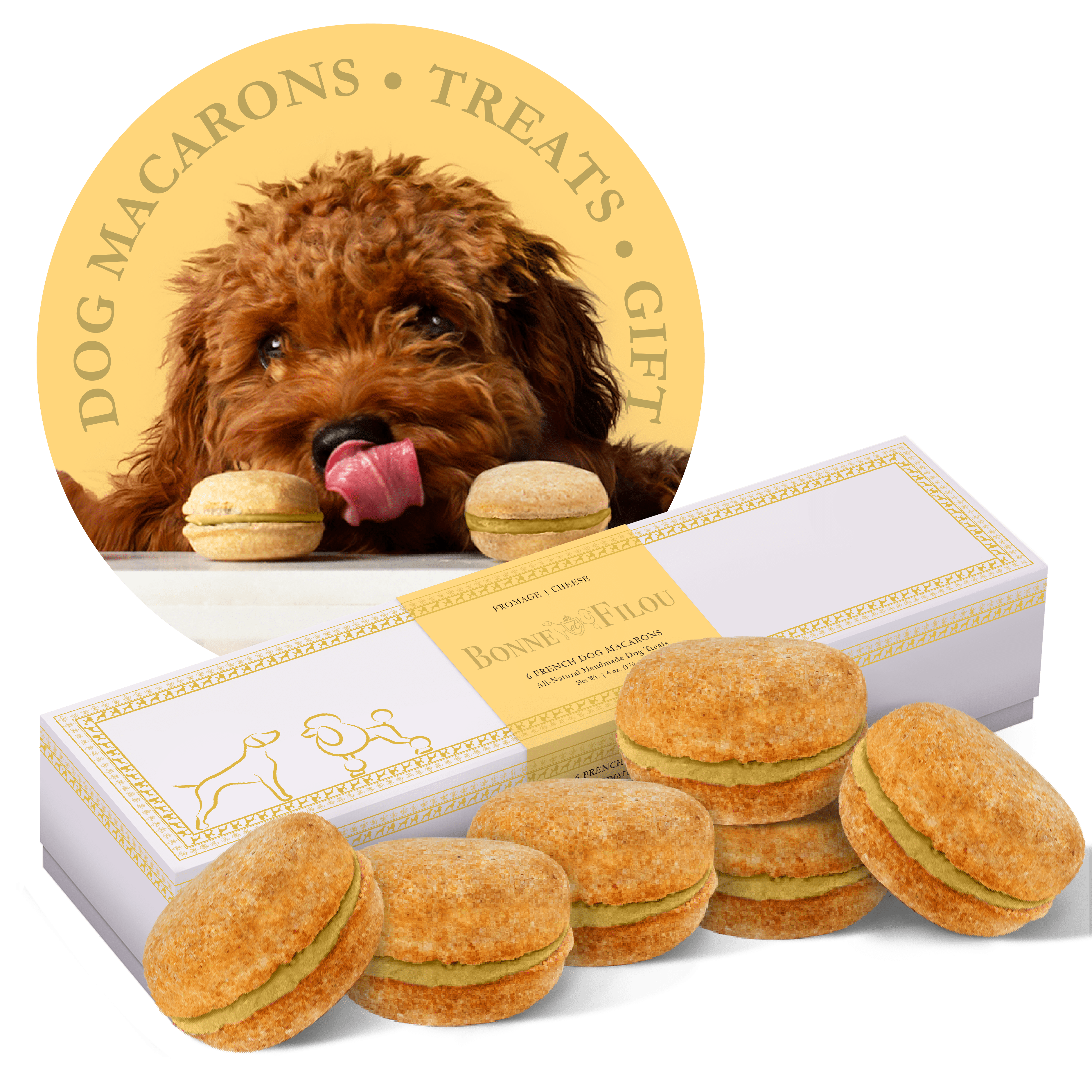 Dog Macarons - Count of 6 (Dog Treats | Dog Gifts)This box of our premium macaron treats features: - Box of 6 dog macarons- Handmade with premium human-grade ingredients in the USA- 100% natural; corn-free; wheat-free ingredients- No artificial coloring or preservatives- Hard treat designed for a long-lasting chew- Shelf life of 12+ months | No need for refrigerationBase Recipe Ingredients: Oat Flour; Honey; Coconut Oil; All-Natural Flavored Yogurt FillingFeeding Instructions:Our treats are hard; designed for a long-lasting chew. For elderly or small dogs; we recommend breaking the treat in smaller pieces (by twisting both sides).