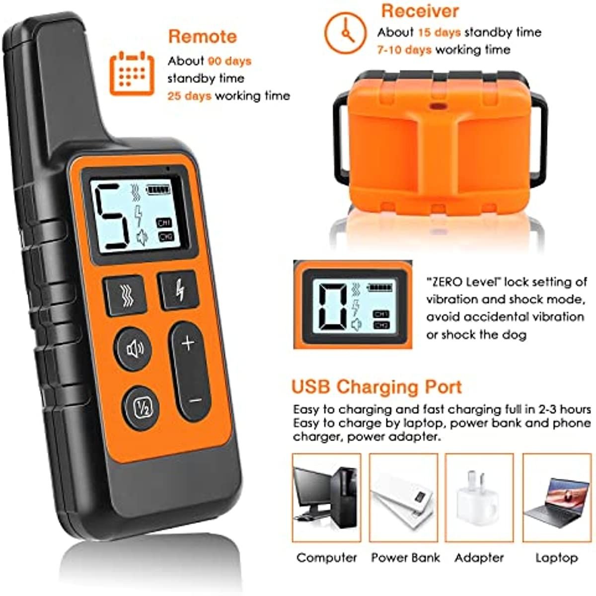 Long Remote Range and Battery Life: This dog shock collar with remote range of up to 1640ft (550 yards) in barrier-free area; 1000 ft (330 yards) in barrier area; you can train your dog easily both indoors and outdoors. Both receiver and remote are rechargeable; it takes 2-3 hours to be fully charged. The receiver's battery can last for up to 15 days in standby time and 7-10 days in working time; and the remote can last for up to 90 days in standby time and 25 days in working time.
